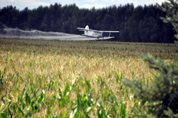 7月29日,位于黑龙江省北安市的黑龙江垦区建设农场用飞机为玉米喷施营养液。
