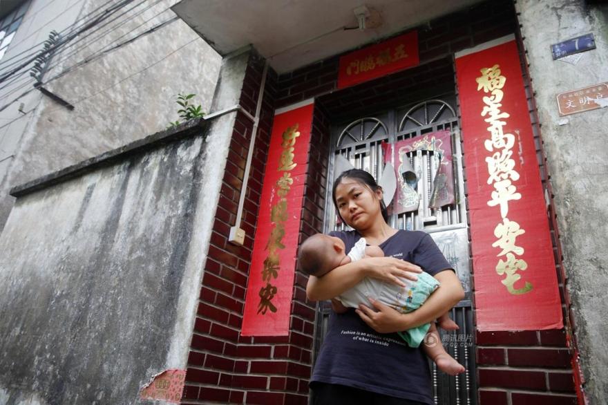 今年7月,广东佛山,阿纯(化名)从湖南娘家生完娃回到位于顺德乐从的家,却发现家门被换锁,丈夫、家婆齐失踪。更让阿纯惊异的是,她随身携带的家门钥匙居然无法打开家里大门。“我一看门锁已经换新,叫老公、婆婆,里面都没反应。”阿纯急忙打丈夫陈某、家婆麦某电话,都无人接听。图为7月28日,阿纯抱着孩子站在上了锁的家门口。