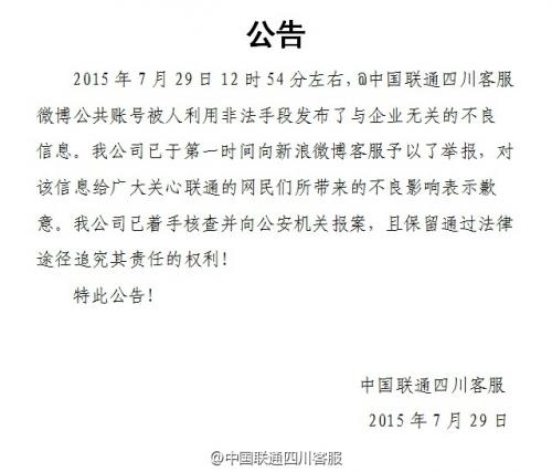 昨晚7时许,中国联通四川客服就此事通报称:7月29日12时54分左右,@中国联通四川客服微博公共账号被人利用非法手段发布了与企业无关的不良信息。我公司已于第一时间向新浪微博客服予以了举报,对该信息给广大关心联通的网民们所带来的不良影响表示歉意。我公司已着手核查并向公安机关报案,并保留通过法律途径追究其责任的权利。