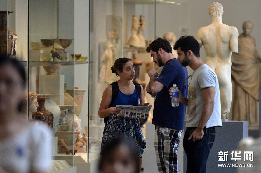 7月28日,参观者在美国纽约大都会艺术博物馆古希腊展厅参观。