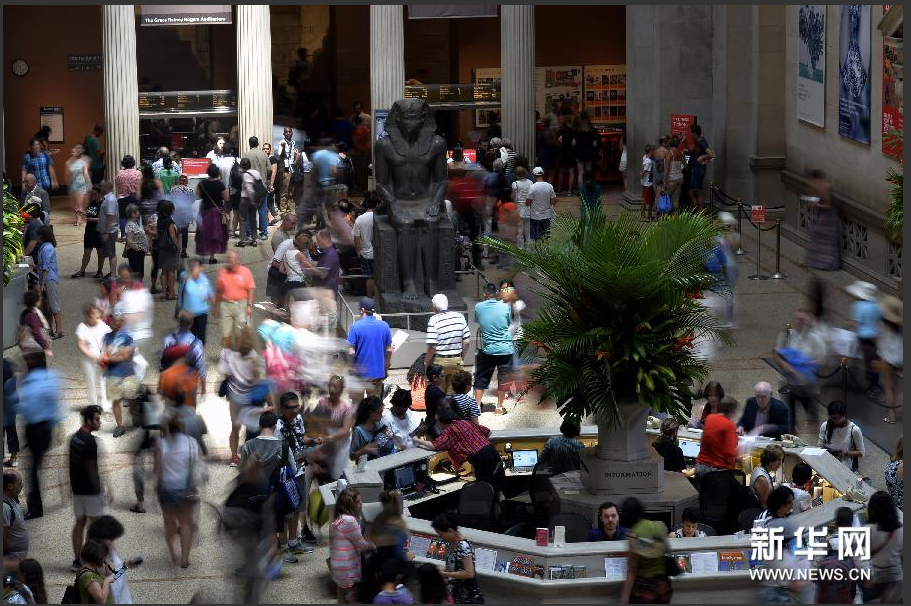 7月28日,参观者在美国纽约大都会艺术博物馆大厅准备参观。