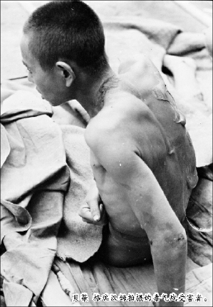 隧道里太黑,无法拍照。格瑞汉姆小姐就请人将其中两位伤员用担架抬到洞外,一位是机枪连副排长韦少阚(音译),另一位是同一个排的机枪手,他们都是在宜昌郊外日军发射第一批毒气弹时受伤的。韦排长艰难地从担架上坐起来,向格瑞汉姆小姐讲述了他们受伤的经过: