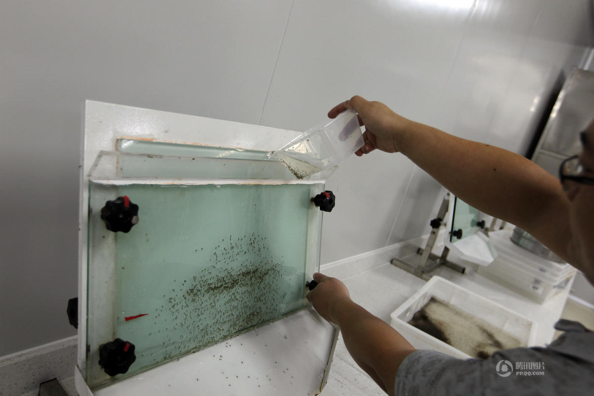 工作人员筛选雄蚊幼体。奚志勇团队是用物理分离法,根据蚊子雌雄幼体大小的明显差异,雄蚊的头胸宽在1.05MM~1.2MM之间,雌蚊的约在1.3~1.4MM,使用水流在玻璃通道内过滤。南方都市报 马强 实习生 肖睿弘/摄