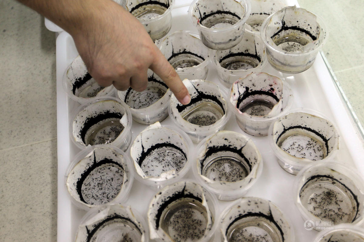 “科学的发展是很有意思的。”最早,他们的想法是,如果让这个共生菌携带上抗病基因,是不是就可以把传病蚊媒改造成不能传???但2009年前后,奚志勇课题组与另一个课题组同时发现,天然的沃尔巴克氏体本身就能形成抗登革病毒的作用。图为培育盒壁上黑泥一样的东西,就是堆积在一起的无数蚊卵。南方都市报 马强 实习生 肖睿弘/摄