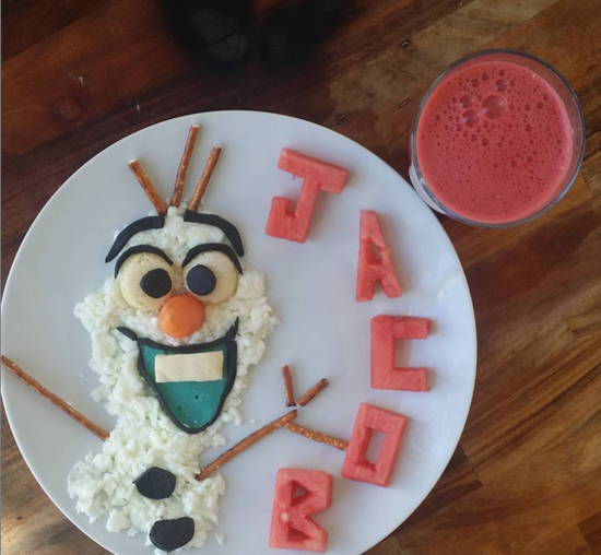 从那之后,每天晚上雅各布睡觉前都会告诉妈妈自己想要吃哪个角色的早餐,可能是来自一本书,一部电影,或是一个玩具形象。决定了主题之后,他们会一起做早餐,“雅各布也有一个小菜板,他会坐在那里试着切一些水果,这成了我们都享受的亲子时光。”