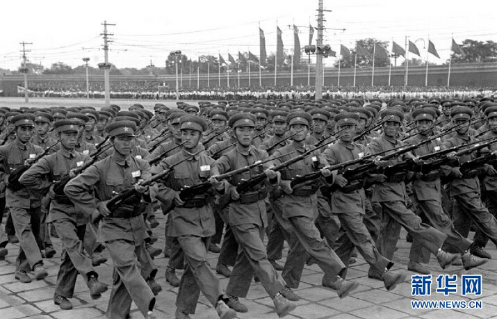 这是1954年国庆阅兵式上,步兵在军乐声中列队经过天安门检阅台接受检阅。 新华社记者葛力群摄(资料照片)