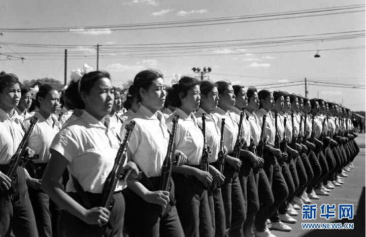 这是1958年国庆阅兵式上,女民兵方队通过天安门广场。 新华社记者胥志成摄(资料照片)