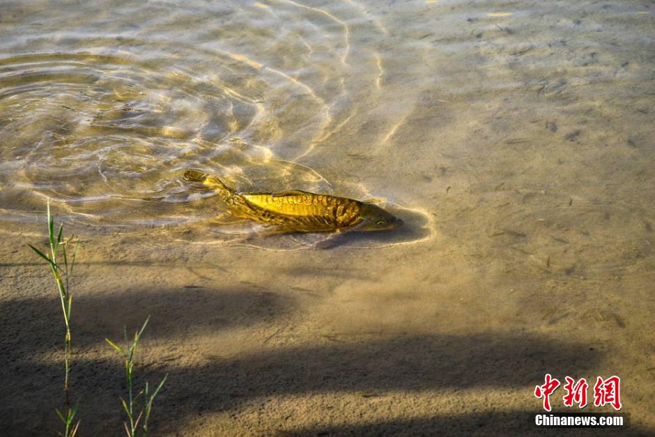 当地没能确切地解释近些年并不常见的群鱼浮出景象。月牙泉位于敦煌城南7公里的鸣沙山北麓,因“亘古沙不填泉,泉不涸竭”而成为奇观。坊间流传,月牙泉有“三宝”:铁背鱼、七星草、五色沙。图为一条漂亮的铁背鱼正在追逐觅食。王斌银 摄