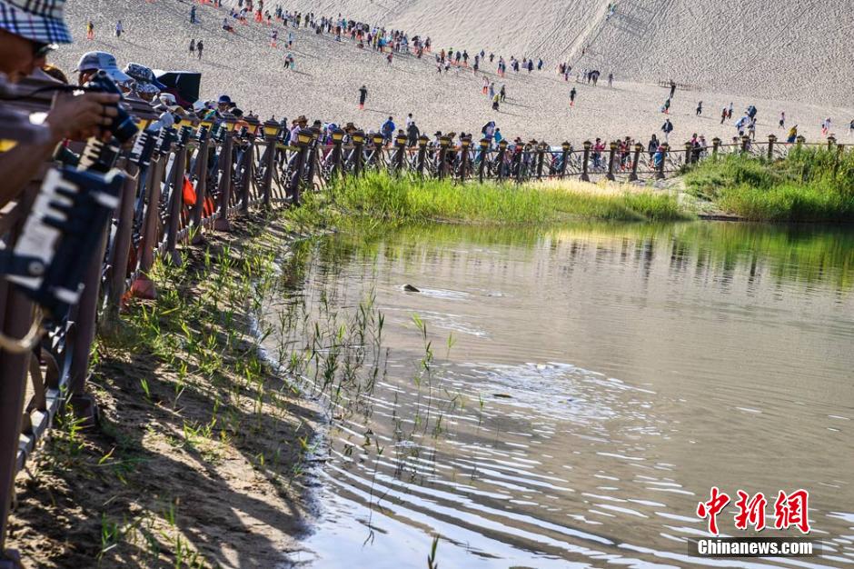 图为大批游客在月牙泉边欣赏畅游的铁背鱼。 王斌银 摄