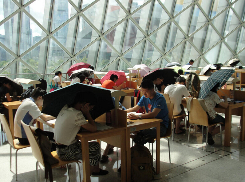 关键词:撑伞读书 深圳图书馆 太阳暴晒