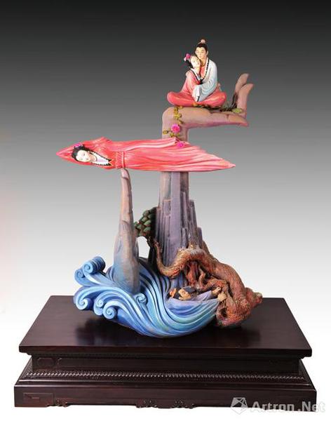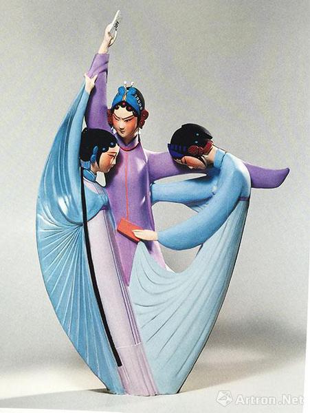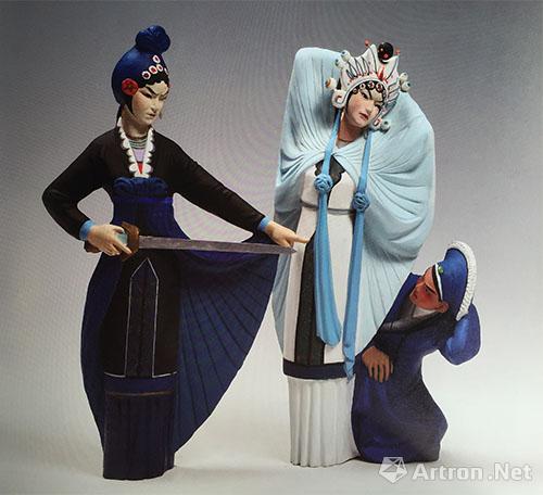 同时,张锠的创作又吸收了很多外来文化和艺术营养,比如曾经创作的一件作品《生死牌》,作品取材于新编古装戏《生死牌》,以椭圆形的适形构图,将三个人物进行有意味的组合,形成实空间和虚空间的对比变化,并强化动势的力度与情节的深度,省略某些细节,使衣纹趋于平面化,裙褶采用阴刻线形方法,增强线的流畅性,单纯并富于装饰性。色彩采用青紫色系,浑然一体。形与色的和谐组合创造了意蕴无尽的想象空间。“这件作品的造型,我吸收了摩尔的《空间论》,强调实与虚的空间关系,三个人物组合成椭圆形的动态,也是吸收了摩尔的语言。”