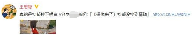 [摘要]王思聪转发关于《偶像来了》抄袭韩综的节目评论,并讽刺:“真的是抄都抄不明白。”不仅引发网友们的热烈讨论,更将《偶像来了》的抄袭争议推至风口浪尖。