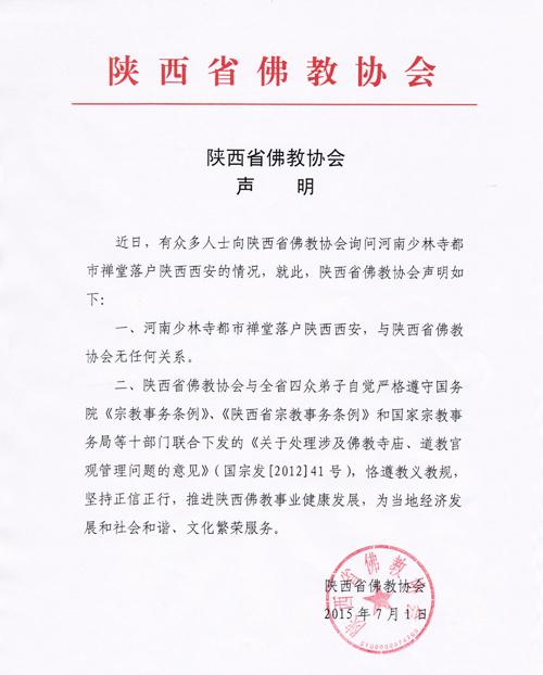 早在2015年7月1日,陕西省佛教协会曾发《声明》称“河南少林寺都市禅堂落户陕西西安,与陕西省佛教协会无任何关系”,并指出“陕西省佛教协会及全省四众弟子自觉严格遵守国务院《宗教事务条例》、《陕西省宗教事务条例》和国家宗教事务局等十部门联合下发的《关于处理涉及佛教寺庙、道教宫观管理问题的意见》(国宗发[2012]41号),恪遵教义教规,坚持正信正行”。