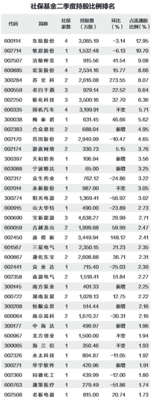 截至昨日,已公布中报的281家公司中,社?;鸸渤鱿衷?7家公司前十大流通股东名单中,合计持股数量8.8亿股,与一季度相比,略微减少4%,可见在6月以来的极端行情中,社?;鸩⑽创蠓醭?。不过从持股变动看,社保二季度则进行了大规模的调仓,减持36股,新进27股,增持19股。在新增个股中,南京银行、??低恿街还缮绫;鸪止墒烤蚬?。社保现身个股中,以前十大流通股东中社?;鸺沂臣?,共有19只股获得两只以上的社?;鸨懦钟?,东睦股份、宏发股份、国机汽车等3股均有4只社?;鹪殉钟?,尤其是东睦股份,社保组合合计持有3085万股,占流通股比例达13%,是社?;鸪止烧急茸罡叩墓善?。