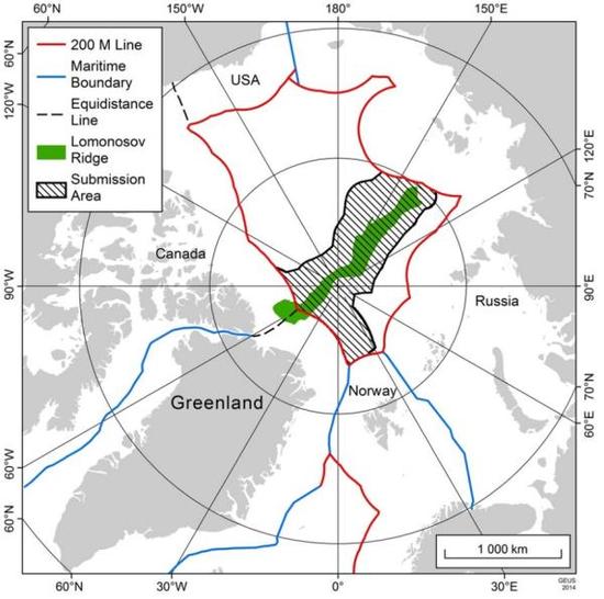 根据国际海洋法,北极圈周边国家拥有从其海岸线到北极大陆架370公里半径之内区域的专属经济特权。但是,俄罗斯基于北极地区罗蒙诺索夫海岭、门捷列夫海岭等都具有大陆构造性质,提出了新的北极大陆架外部边界划定方案。