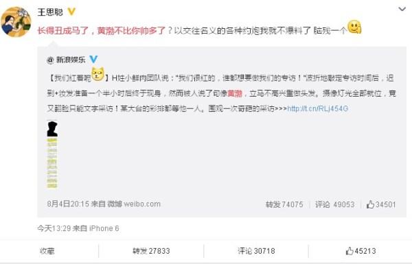 关键词:小鲜肉耍大牌 王思聪 黄渤比你帅