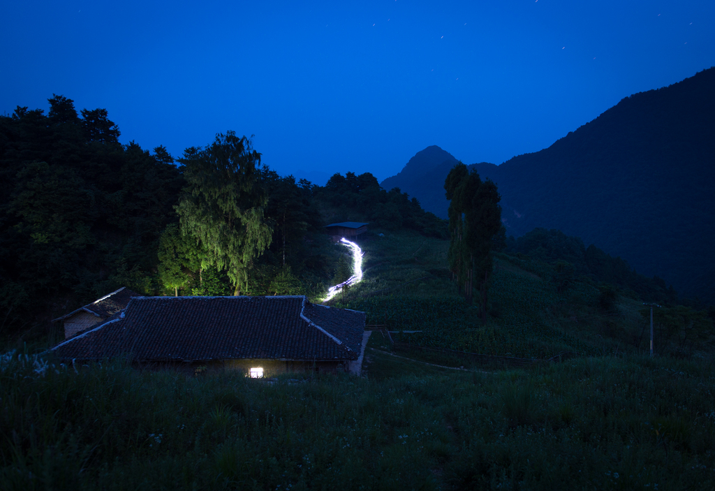夫妻二人巡山归来已是深夜,他们依靠电筒的光亮,走在蜿蜒的山路上。
