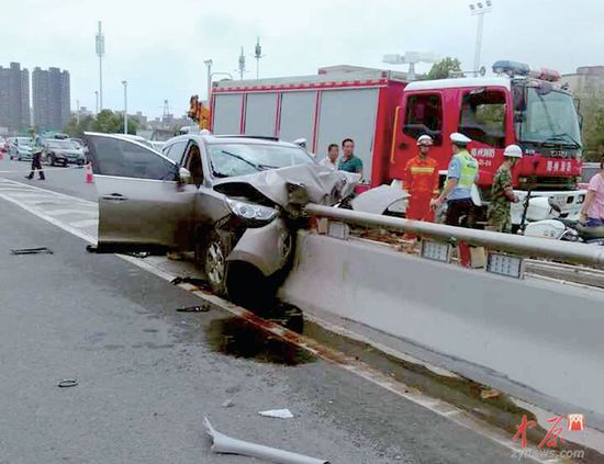 越野车车头部位受损严重,驾车男子打开车门招手拦车。郑州消防支队战士罗执平驾车经过停了下来。
