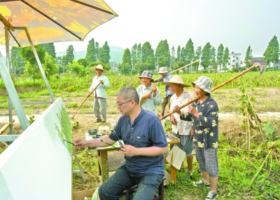 7月17日,许江在浙江省海盐县澉浦镇紫金山村写生,描摹台风过后的葵园。
