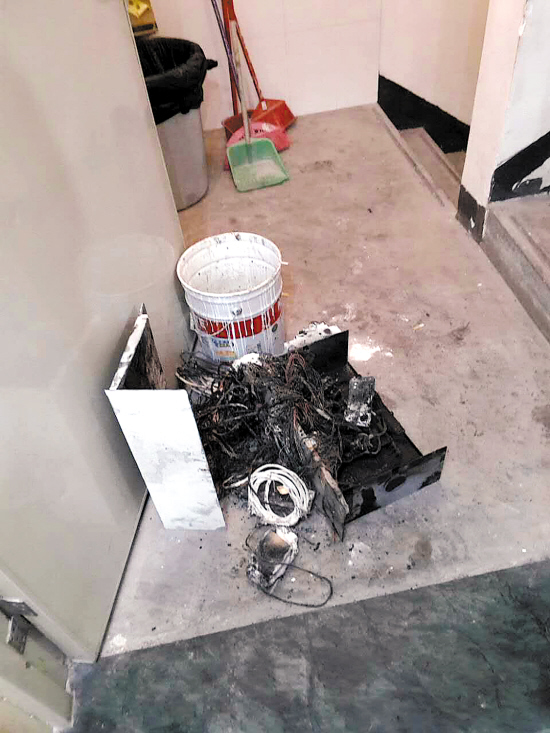 维修工从电梯顶部拆下已烧得面目全非的电路板,是这次事故的元凶