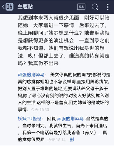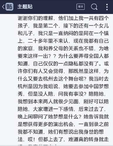 随后,自称是当事人张懿的网友也在网上发帖,说自己其实是被骗到梦想秀的舞台上,姐姐说梦想是获得更多演出机会,邀请她陪着去。但是上台突然说起她的身世。而且同在一个镇子父母20多年都不来相认,现在又来这么一出,很委屈。