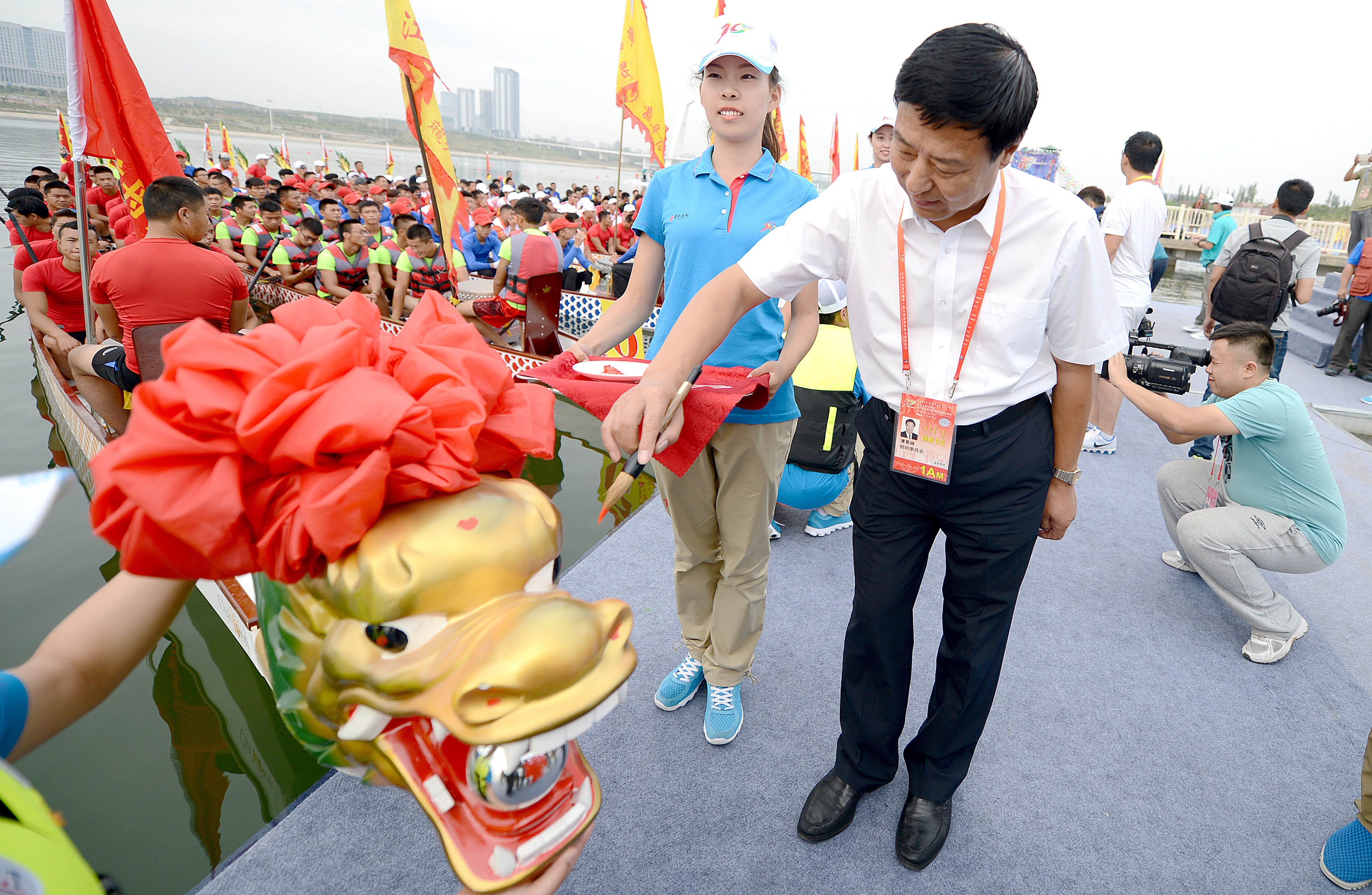 内蒙古自治区体育局局长谭景峰为龙舟点睛描红。人民政协报记者 田福良\摄