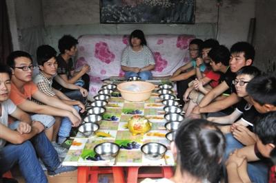 7月30日中午,静海县一个传销窝点,传销人员围坐在餐桌前等待开饭。午饭是白水煮面条。