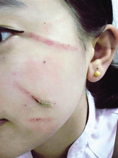 被打女乘务员拍下的照片显示,殴打她的乘客在她脸上留下了多道抓痕。 人民日报微博截图