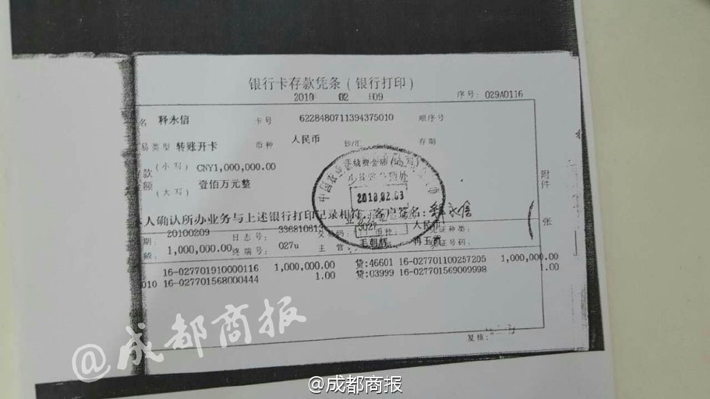 举报团还向成都商报记者首次提供了有释永信名字的银行交易凭证等证据,释延鲁称释永信向他个人索取财物就高达700余万。