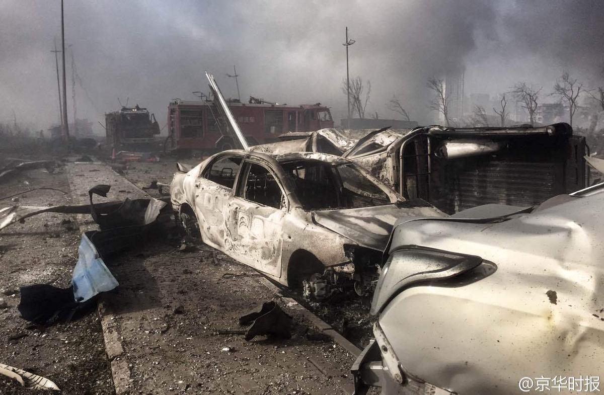 天津滨海新区跃进路上被炸毁的车辆。京华时报 韩天博 潘之望 摄
