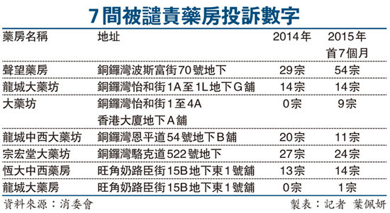 《星岛日报》报道说,香港消委会在今年前7个月,共收到531起涉及药房的投诉,比去年同期上升13%,当中有近四分之一都集中在被点名的7间药房。当中,以天价向游客出售黑鬼油,最终结业的铜锣湾“声望药房”被投诉最多,达54次。而在百多起投诉中,只有35起达到和解,比例少于三成。