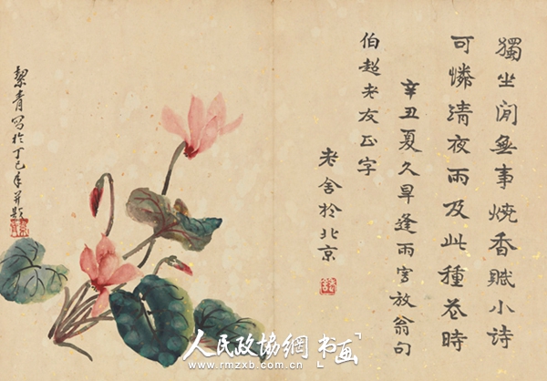 对于白石老人与老舍、胡絜青夫妇的这段因缘,舒乙先生回忆:“在近代文人中,老舍、胡絜青夫妇与齐白石老人的交往有着不少精彩的故事。我母亲胡絜青1951年拜白石老人为师学习绘画。白石老人有个特点,他教画时不太爱说话,只让你在旁边看他画。而胡先生一看就看了4年。”
