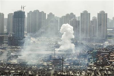 8月16日,记者使用航拍器,在500米高空拍摄天津滨海新区瑞海公司危险品仓库爆炸事故现场,远处为渤海湾。 新京报首席记者 陈杰 摄