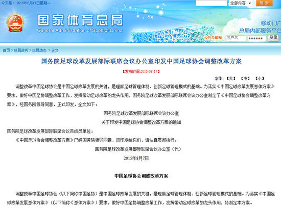 国务院足球改革发展部际联席会议办公室印发中国足球协会调整改革方案