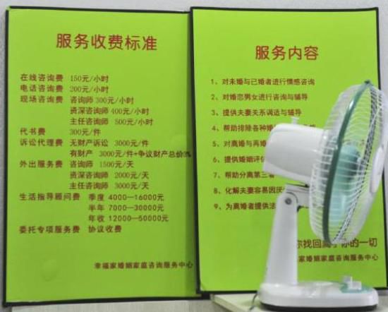 而收费标准,包括在线咨询150元/小时、电话咨询200元/小时,现场咨询最高500元/小时。而外出服务费用,普通咨询师1500元/天,资深咨询师2000元/天,主任咨询师3000元/天。据介绍,有的“小三”劝退工作,耗时长达三四个月,因此费用不低。