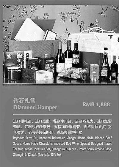 今年推出月饼搭配高档商品的酒店不在少数,比如国贸大酒店推出两款月饼礼篮,分别为价格1588元的“翡翠礼篮”与1888元的“钻石礼篮”。销售人员提供的月饼宣传单页显示,葡萄酒、橄榄油、鲍鱼、苹果手机?;ぬ?、茅台酒等13种搭配商品,价格从88元到1000元不等,顾客可以根据送礼的需求任意搭配。