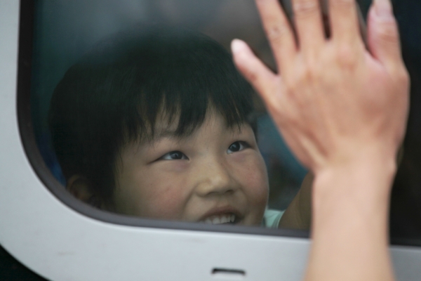 8月25日,在山东省威海市文登火车站,一名小朋友向前来送行的家人道别。新华社发(陈宏青 摄)