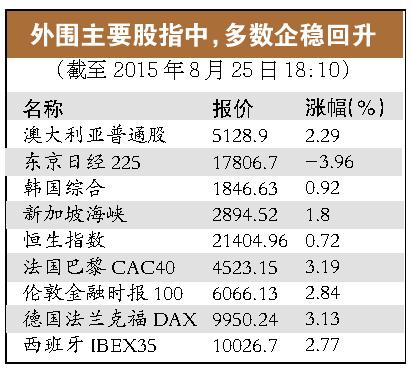 多个地区市场宣布救市及中国央行降准降息后,外围股市昨日已率先反弹。日经225指数虽跌了3.69%,但盘中一度上涨近2%;在中国台湾地区准备干预股市后,台湾加权指数周二大涨3.51%;同时,恒指指数、韩国综合指数、新加坡海峡时报指数等都全线飘红。另外,欧洲股市周二早盘也大幅高开,欧洲主要指数盘中涨幅都超过4%。在中国央行宣布降准降息后,外围股市涨幅进一步扩大。