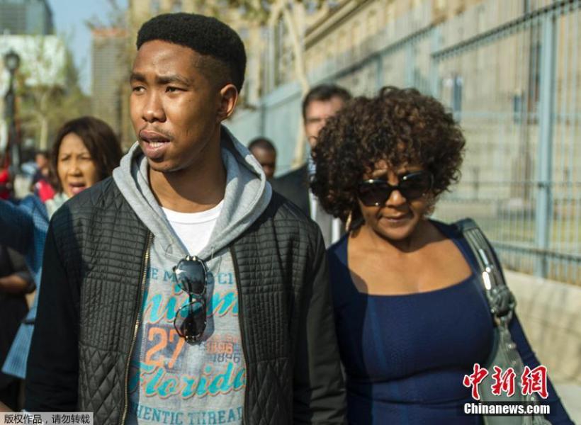 当地时间2015年8月25日,南非约翰内斯堡,南非前总统曼德拉一名孙儿,24岁的姆布索( Mbuso Mandela)因涉嫌强奸一名15岁少女被捕,曾于17日出庭受审。家人25日出席保释听证会,姆布索成功获得保释。案件令曼德拉家族形象进一步受挫。2013年去世的曼德拉因领导南非黑人反种族隔离运动赢得举世赞美,但其后人为争夺遗产而对簿公堂,令家族形象受损,他的长孙曼迪拉(Mandla)今年较早前袭击一名司机而被判袭击罪名成立,正在上诉。