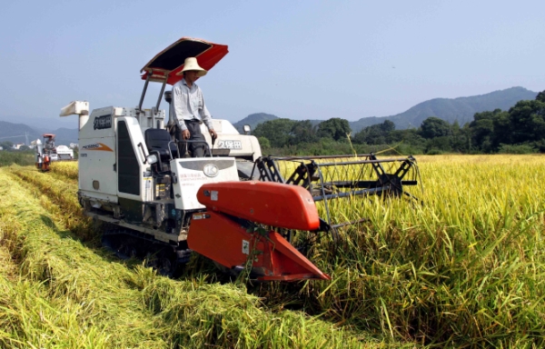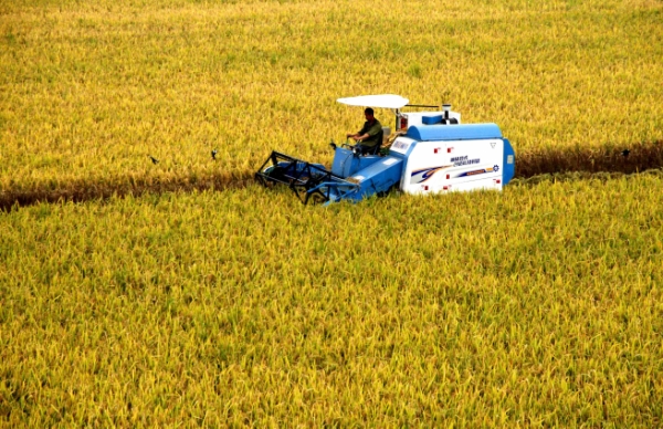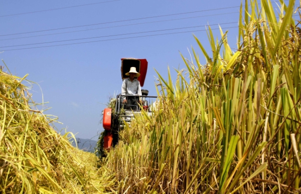 8月26日,江西省宜春市靖安县仁首镇石下村农民驾驶农机在收割中稻。