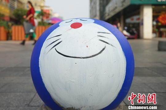 8月25日,萌萌哒“蓝胖子”涂鸦出现在南京浦口街头的路墩和井盖上,不仅令行人注意脚下安全,美化城市道路,同时也增添了一份生活情趣。