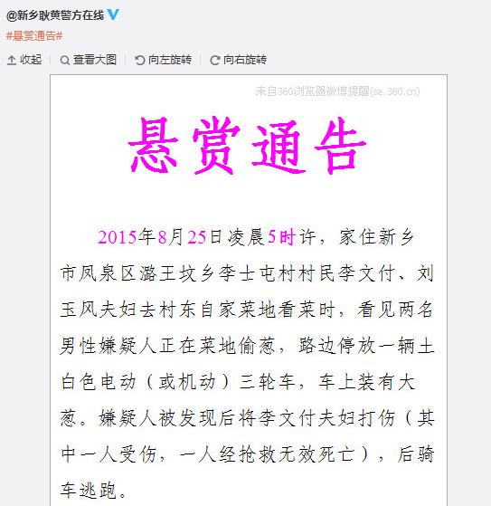 然而,这不过又是一起反转新闻。在一片质疑声之下,似乎没有多少人发现,作为当事警方的官方微博,@新乡警方在线于26日16点半左右发出的悬赏通告显示,被舆论简化为悬赏30000,只为追缉两名偷葱蟊贼的“闹剧”,其实真相是,嫌疑人在偷葱被发现后,将菜地主人夫妇打伤,造成一死一伤。也就是说,悬赏金额之所以达到3万元,是因为嫌疑人已经关涉“命案”。