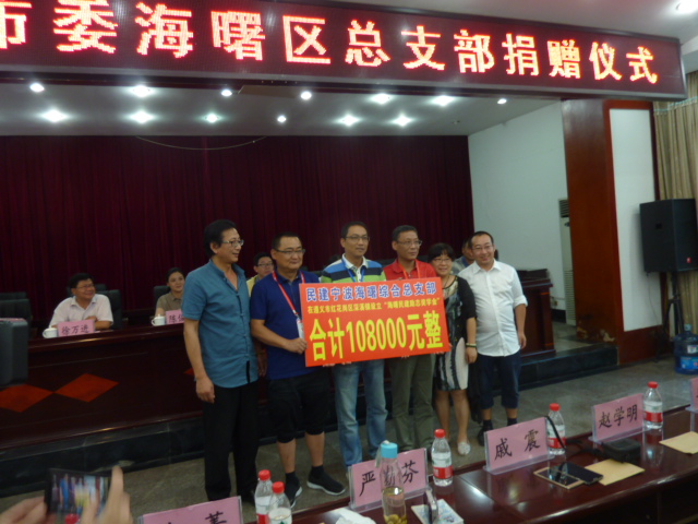 2015年8月21日下午 ,捐赠仪式在红花岗区深溪镇举行。仪式上,民建宁波市委常委、海曙区总支部主委曹云将“海曙民建励志奖学金”共计108000元爱心捐款捐赠给深溪镇人民政府。该奖学金将用于今后五年深溪镇初中、大窝中学一年级、二年级共36个班每年每班一名品学兼优的学子进行学年奖励。