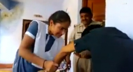 国际在线专稿:据外媒7日报道,一段印度高中女生暴打“性骚扰者”的视频近日在网络走红。视频中,印度女孩一边打骚扰者,一边要求道歉。而这一幕竟然发生在警察局,视频中能清晰看到警察站在一旁围观,还能听到拍摄者要求被打的骚扰者面向镜头。