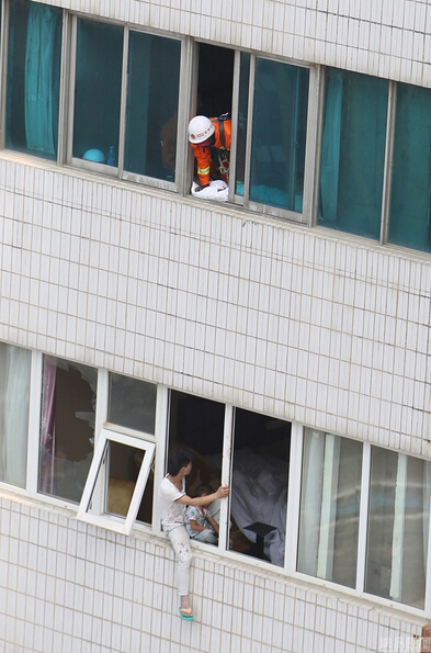 另据报道,男子为广西人,因今年孩子上学需开出生证明,做亲子鉴定时发现孩子并非亲生,跟前妻索要赔偿未得到同意,随做出抱孩子跳楼的决定。记者还电话采访了火车站派出所,但派出所不愿透露跳楼具体原因。图为消防战士继续尝试营救,但没成功。