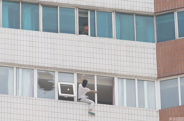 直到下午2点,记者离开时,男子仍不愿放弃轻生念头,救援暂无进展,他和孩子已经在窗边僵持了5个小时,观望者也陆续离开现场。中途,孩子曾内急,男子却不愿将孩子解下来,却对着窗户给孩子把尿。图为消防战士欲从上面展开营救,但被男子发现,指着消防员开始骂。
