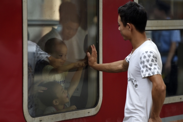 8月28日,在杭州火车站,在杭州工作的刘先生送别回四川达州老家的两个孩子。