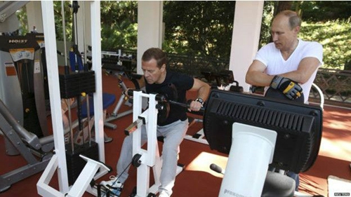 以强人形象示人的普京和梅德韦杰夫30号上午在索契的总统官邸,一起健身。普京练起器械来专业范十足,轮到梅德韦杰夫上阵时,他还在一旁指导。