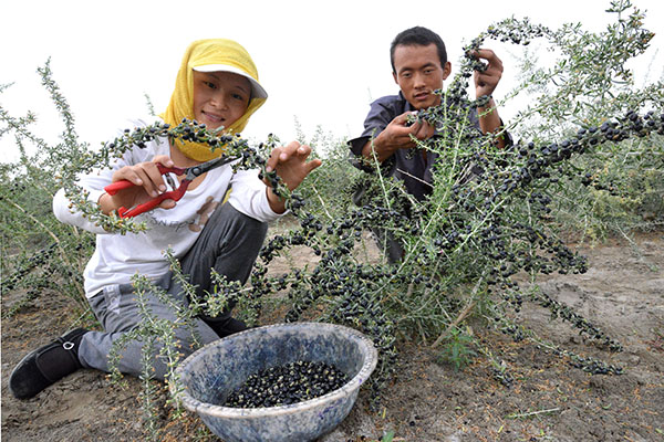 8月27日,新疆生产建设兵团第二师二十九团农民在盐碱地里采摘黑枸杞。