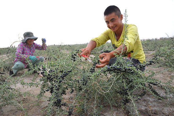 8月27日,新疆生产建设兵团第二师二十九团农民在盐碱地里采摘黑枸杞。